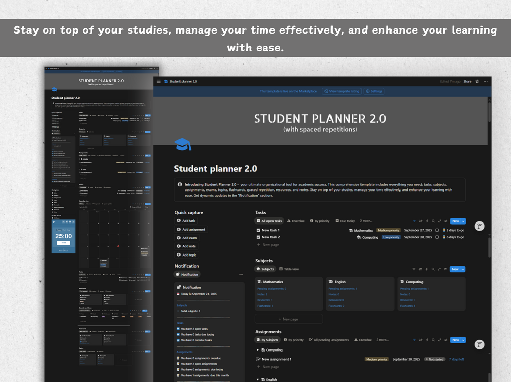 Student planner 2.0 - with spaced repetitions, flashcards & dynamic notification - Notion template