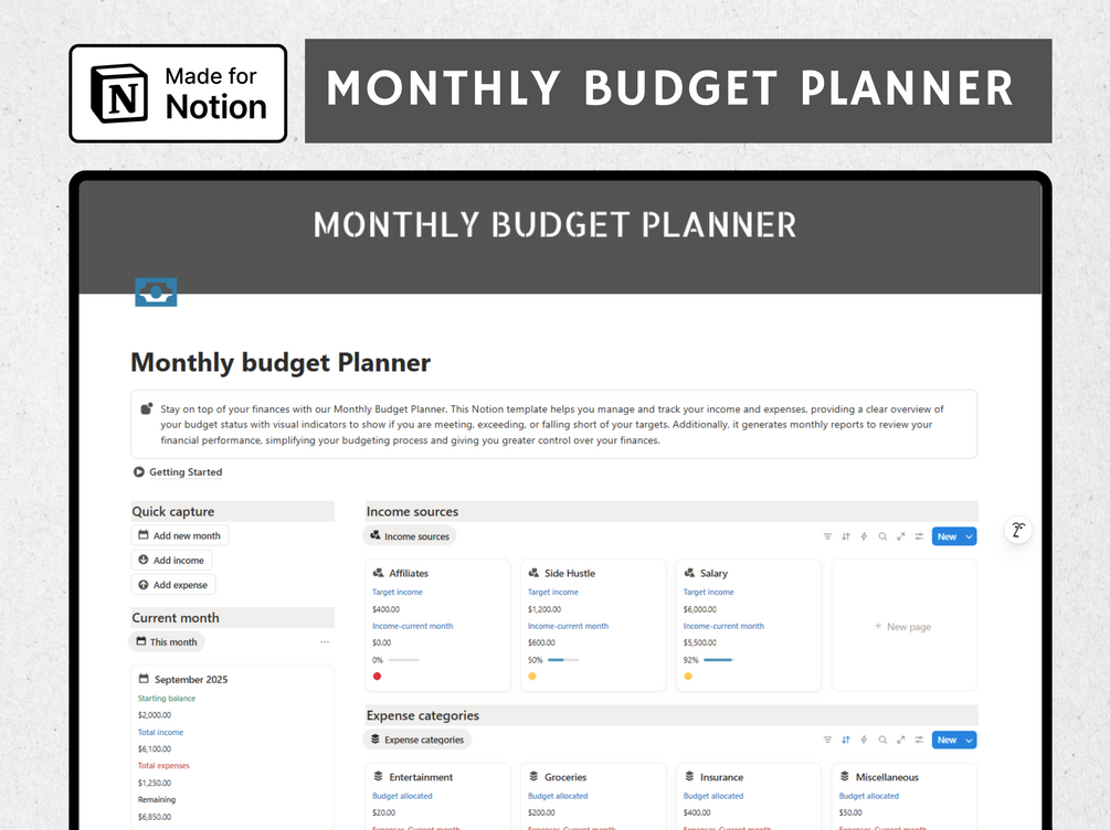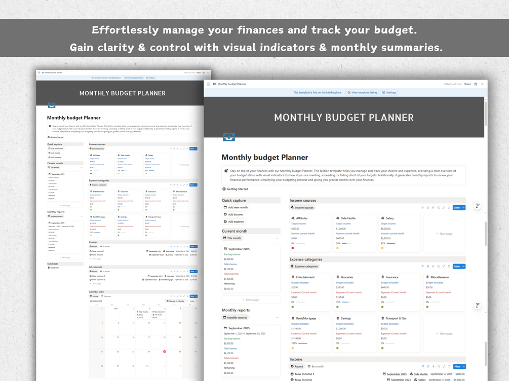Our Monthly Budget Planner is your ultimate tool for managing finances efficiently. This Notion template helps you track income, manage expenses, and monitor your budget with ease.