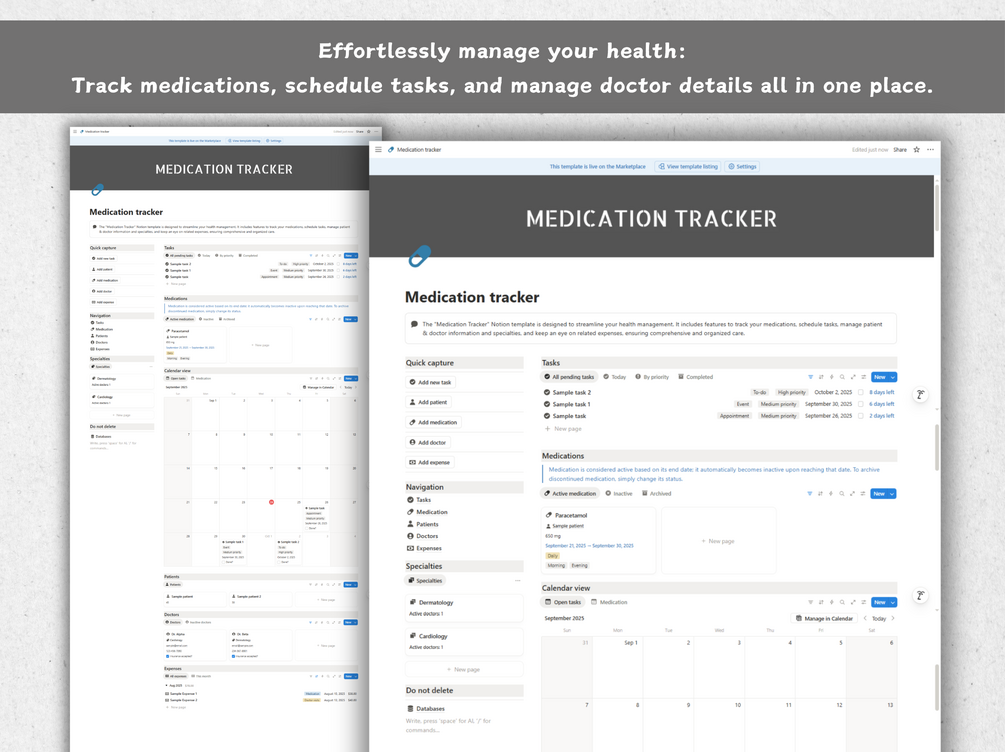 Take control of your healthcare with this all-in-one Notion template. This comprehensive Medication Tracker is your central hub for managing prescriptions, appointments, and wellness.