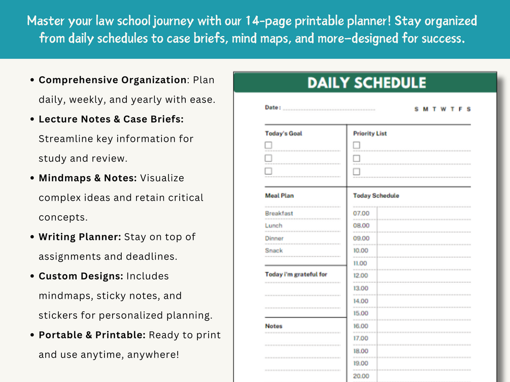 Our 14-page Printable Law School Planner is designed to help you stay organized, productive, and focused throughout your law school journey. This 8.5x11 inch planner offers a comprehensive range of tools to streamline your academic life:
